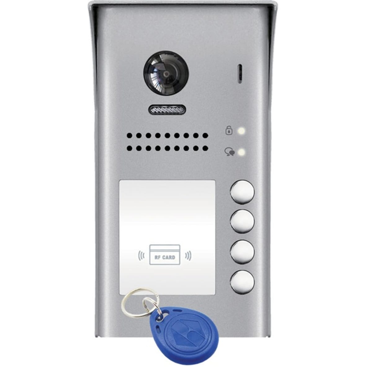 Панел видеодомофон DVC DT607/FE/ID/S4/RH с вградена цветна fish-eye 170° камера с висока резолюция 500 TVL; Четири бутона за повикване на абонати; С вграден RFID (125kHz) четец. За повърхностен монтаж; LED осветление за нощно виждане. IP44 клас на защита. Съвместим със всички DT двупроводни системи; Програмируемо време за заключване-1-9 сек; Време за разговор- 90сек. Захранване : DC 24V (с PS4-24V или IN-LRS-100-24); Консумация: 300mA; Захранване за насрещник: 12Vdc/250mA или релеен изход; IP54; Размери: 176 x 90 x 27мм