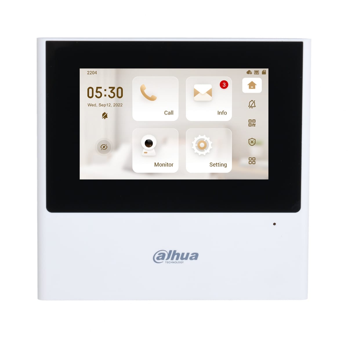 Хибриден IP/2-wire 4,3-инчов цветен TFT капацитивен touch монитор за видеодомофонна система. Резолюция 480х272. Поддържа Intercom връзка. Вграден високоговорител и микрофон. Двупосочно аудио. Поддържка на IP камери Dahua. Алармени фукции с 4x алармени входа, 1x алармен изход. Ethernet RJ-45 порт 10/100Mps, WiFi IEEE 8203.11b/g/n. Протоколи: TCP/IP, компресия H.264/G.711, PCM. Захранване DC48V/1A. Работна темп.: -10~55ºC. Подходящ за повърхностен монтаж. Размери: 136.0mm×140.0mm×25.5mm.